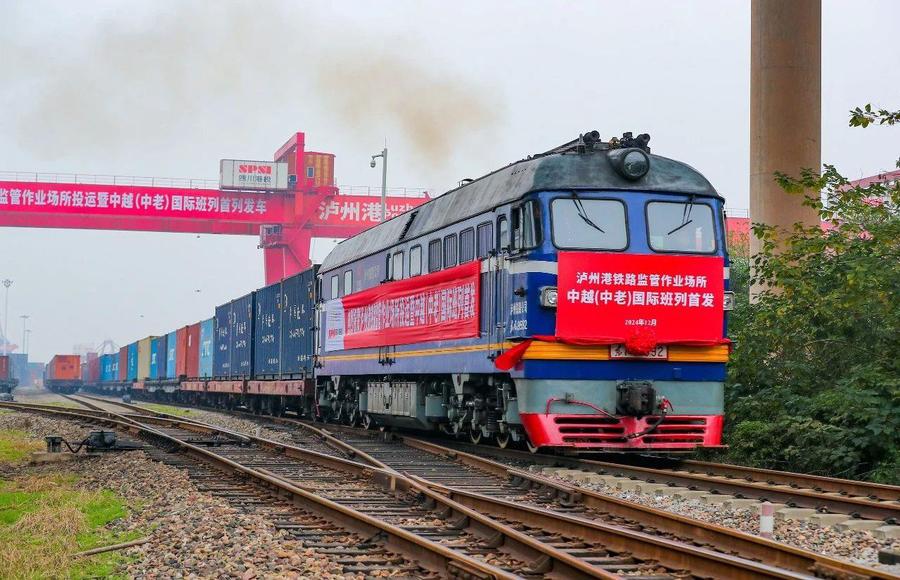 △2024年12月18日,四川泸州首列中越(中老)国际班列,从泸州港国际集装箱码头进港铁路专线缓缓驶出。