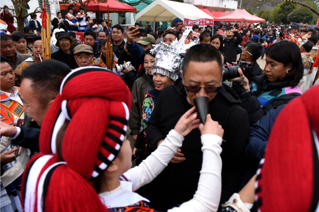 迎宾门前,十张长条木桌摆成“酒阵”,苗家姑娘们唱着迎客歌,端着竹筒酒拦住远道而来的客人。贵阳来的摄影爱好者王先生连喝三碗拦门酒,脸颊泛着红晕笑道:“这酒还没喝完,相机都快端不稳了。”