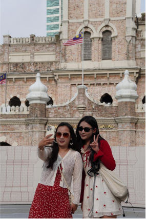 两名来自中国云南的游客在马来西亚首都吉隆坡地标性历史建筑苏丹阿卜杜勒·萨马德大厦前合影。人民日报记者俞懿春摄