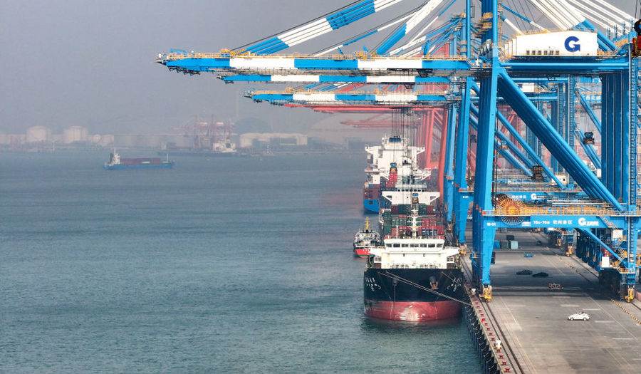 2024年12月31日,远洋货轮在钦州港集装箱自动化码头排队卸货(无人机照片)。新华社记者吕帅摄