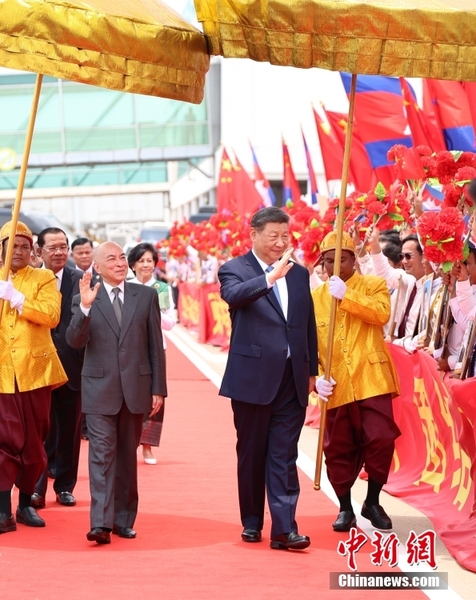 当地时间4月17日上午,中国国家主席习近平乘专机抵达金边,应柬埔寨国王西哈莫尼邀请,对柬埔寨进行国事访问。西哈莫尼在机场为习近平举行隆重欢迎仪式。中新社记者 盛佳鹏 摄
