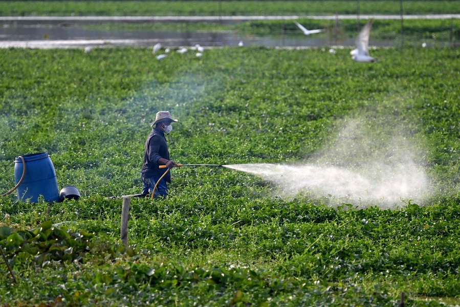 当地时间2025年2月20日,柬埔寨金边郊区,一名农民在地里喷洒农药。