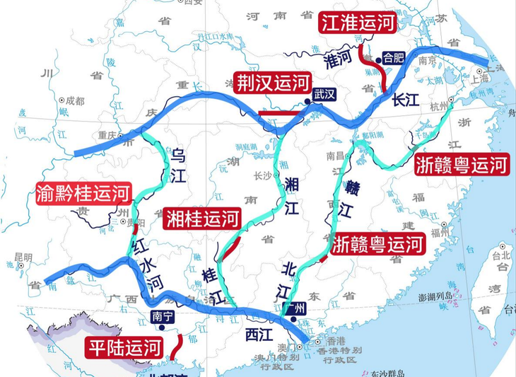 早在2023年全国两会上,重庆代表团提交的《进一步高水平共建西部陆海新通道》的全团建议,就包含了支持研究论证“渝黔桂”运河连通平陆运河等事项。借助这条新通道,长江上游的省份将能够直接向南出海,无需绕道长三角地区,更有利于开拓东盟市场。