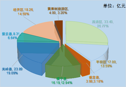 分地区看,新开工亿元以上项目中,西秀区9个,总投资33.49亿元;关岭自治县5个,总投资23.89亿元;安顺经开区5个,总投资18.26亿元;平坝区3个,总投资17.00亿元;镇宁自治县4个,总投资16.19亿元;紫云自治县3个,总投资8.31亿元;黄果树旅游区1个,总投资4.00亿元;普定县1个,总投资3.98亿元。