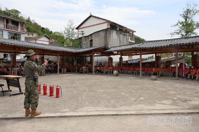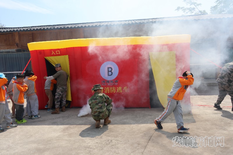 在溥博研学基地,关岭自治县实验学校的300多名学生正在参加生命安全教育课程,他们先是在教官的指导下了解和体验了灭火器的正确使用方法,而后分批次走进地震灾害模拟教室、火灾模拟房,切身感受地震灾害发生时的晃动感和烟雾缭绕的火灾场景,并按照所学到的要点有序跑出教室,来到安全地点集合。