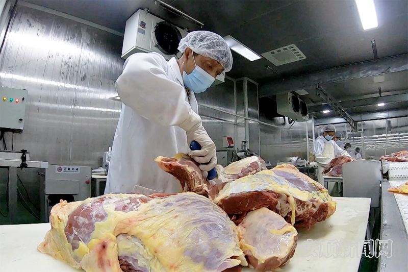 “关岭牛产业园屠宰场引进了查韦斯国际标准屠宰设备,通过这条机械化、自动化、智能化的生产线,能够大大节约屠宰时间,提高生产效率。”贵州黄牛产业集团食品有限责任公司关岭屠宰场负责人张虎告诉记者,目前屠宰场生产线上现有工人40名,日屠宰量保持在30至40头,日发货量为6.7吨左右,其产品主要销往上海、广东、浙江等地。