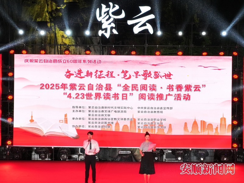 4月26日,2025年紫云自治县“全民阅读·书香紫云”阅读推广活动在紫云印山广场举行。活动中,来自全县的14家机关单位、学校及社会团体先后朗读了《少年中国说》《我在书里等你》《谁是最可爱的人》等作品,进一步激发全民阅读的热情,推动“书香紫云”建设。(安顺日报融媒体中心记者 姚福进 摄)