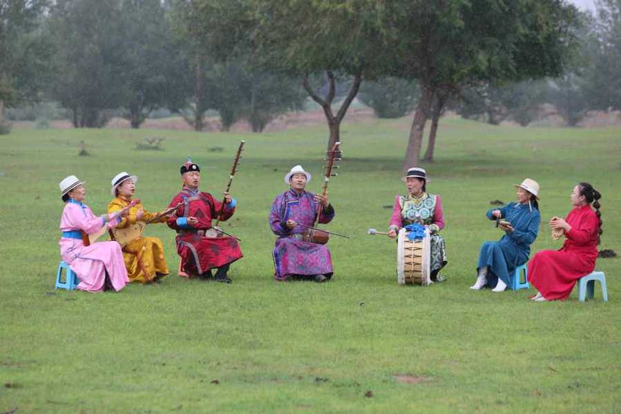 2024年7月16日,《格萨(斯)尔》史诗说唱传承人在内蒙古赤峰市巴林右旗户外表演。(胡斯楞摄)