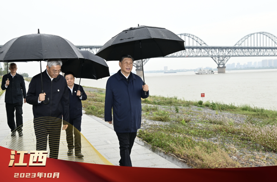 2023年10月10日下午,习近平总书记在江西九江市考察,冒雨在江边察看,了解当地长江国家文化公园建设、长江岸线生态修复等情况。10月12日,总书记在进一步推动长江经济带高质量发展座谈会上回顾长江经济带发展历程,感慨:“做就要做好,坚定做下去。笃行不怠,一以贯之,久久为功。”