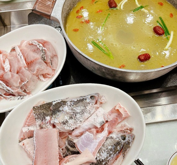 在刘老实食府,师傅熟练地将鱼骨剔出来,先拿来熬汤,然后将鱼切成薄厚均匀、近乎透明的鱼片,放入滚烫的砂锅中涮煮几秒钟,鲜嫩的鱼片便熟了,再蘸上店内特制的小米椒蘸水,鲜辣的味道瞬间在口中散开,让人欲罢不能。