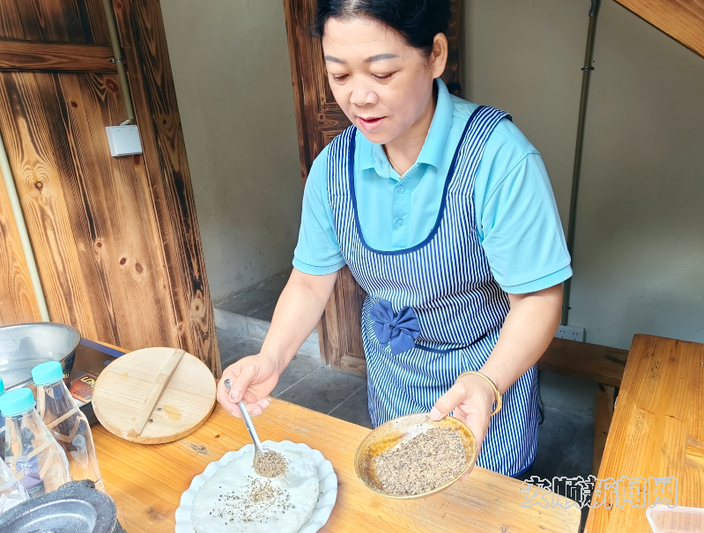 张艳一边做一边向记者介绍:“松糕粑的‘松’寓意长寿,‘糕’则是代表步步高升,糕上的红糖和酥麻,则象征着红红火火、幸福美满,所以,以前屯堡人家有喜事才会专门制作这道小吃。现在随着安顺旅游火起来了,游客来自全国各地,甚至有国外的,我很开心能把家乡的美食推荐出去,让越来越多人喜欢上我们的松糕粑!”