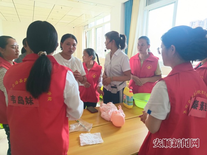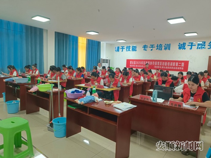 在同期开展的紫云自治县2025年东西部协作保育员初级培训班第二期现场,授课老师正逐一对学员的实操动作、流程规范、技能要点进行指导。