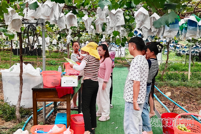 走进安湖村葡萄园,晶莹剔透、饱满多汁的“阳光玫瑰”“浪漫红颜”“葡之梦”“巨盛”等品种在阳光下闪耀着诱人的光泽。游客们手提果篮,穿梭于藤蔓之间,细心挑选、亲手剪下心仪的果实,欢声笑语中满载着丰收的喜悦。来自重庆的游客王女士笑盈盈的说:“葡萄口感好,既有甜度又有果味,我们现采现吃体验不错,打算再带点回去和家人朋友分享。”