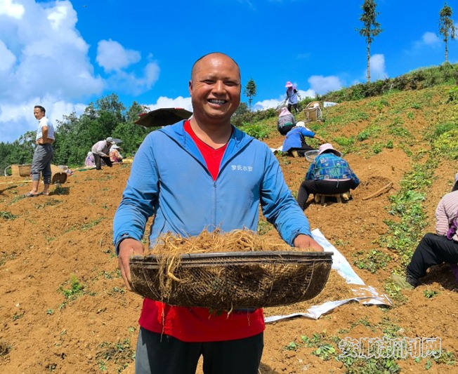 紫云自治县坝羊镇新山村村民雨作田种植的230余亩太子参迎来丰收,村民抬着刚采收的中药材脸上露出丰收的喜悦。 □记者 李伟 摄
