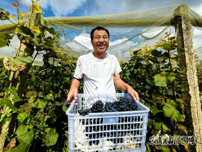 普定县玉秀街道秀水村葡萄迎来丰收,种植户曾明科抬着刚采摘的葡萄脸上露出丰收的喜悦。 □记者 李伟 摄