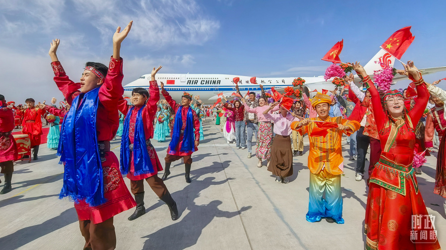 23日下午,乌鲁木齐天山国际机场鼓乐喧天。总书记乘坐的专机在机场降落,等候在停机坪的新疆各族各界群众热烈欢呼。