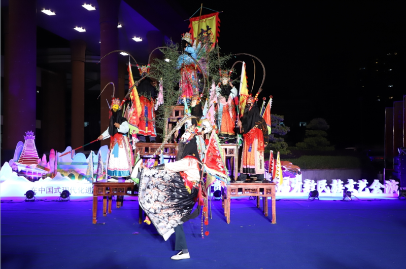 现场演出中,恢弘的战争场面、细腻的生活场景与磅礴的民族舞蹈交替呈现。灯光随场景切换,音响精准呼应,将鲍家拳的刚劲、地戏的古朴、花灯的灵动在舞台上一一呈现,深深打动了现场观众。