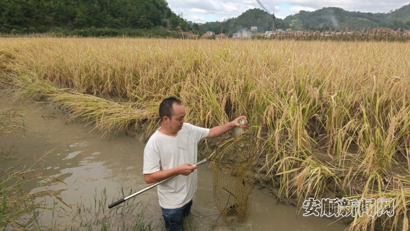稻谷金黄,鱼儿肥跃。9月24日,紫云自治县格凸河镇猫场村的稻渔综合养殖示范田里,村支书韦国万手持网兜,在稻田间的水沟里捞起一条条鲜活的鲤鱼。