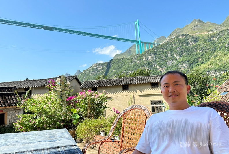 在花江村布依桥缘居民宿的院落里,客人们围坐一起远观花江峡谷大桥,厨房里,老板林国权忙着切菜做饭,张罗美食。随着花江峡谷大桥通车在即,林国权也忙得不亦乐乎。