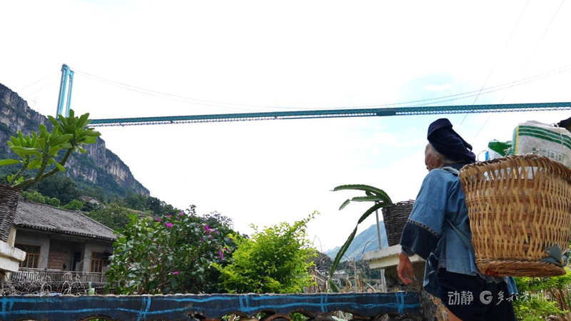 73岁的村民罗金芬穿上了传统布依族的服饰,在颠簸的山路上,她不时张望着大桥的方向。