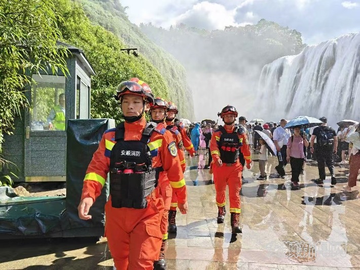 节日期间,针对景区内人流量大、人流集中的特点,大队全体指战员全员在岗、全时值守、全心服务,重点开展景区执勤安保和“蓝焰黔行”志愿服务活动。在大瀑布、陡坡塘核心区域设立两个“蓝朋友”志愿服务站,集前置执勤、安全宣传、应急救助、便民服务四项功能于一体,储备了消防应急、医疗急救、便民用品三类物品,便于及时为有需求的游客提供帮助。另一方面,每天安排至少6名队员动态巡逻防控,及时响应各类求助,并深入各类作业场所开展帮扶指导,及时发现并消除隐患。