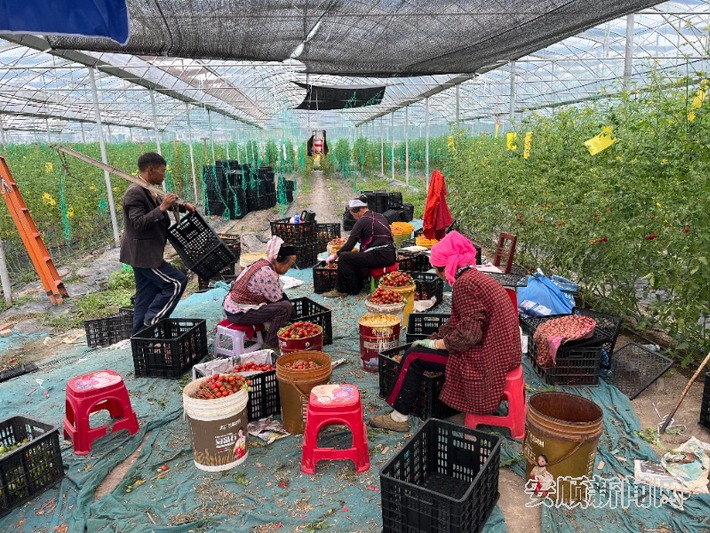 秋天是丰收的季节,在西秀区东屯乡本桥村的蔬菜大棚种植基地,连片的标准大棚整齐划一,棚内嫩绿的藤蔓间缀满了鲜红饱满的圣女果,工人们穿梭其间忙着采摘、分拣、打包,一派丰收忙碌的景象。
