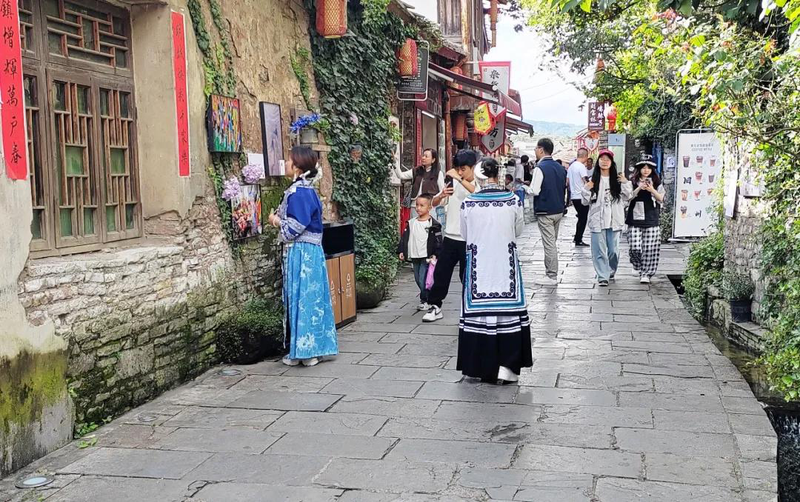 古镇街巷里,非遗体验店的蜡染布料随风飘动,旅拍店的苗装、屯堡服饰成了“抢手货”,特色餐馆飘出的辣子鸡香气勾人食欲,小锅茶坊里传来阵阵闲谈声。来自重庆的小齐和同伴穿着苗装,在古镇牌坊下拍照打卡:“在小红书刷到旧州古镇就被种草了,来了发现设施特别全,累了有地方歇,饿了有地道美食,这份‘慢生活’太舒服了!”