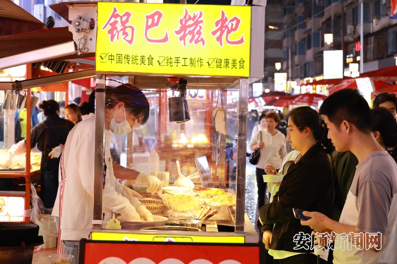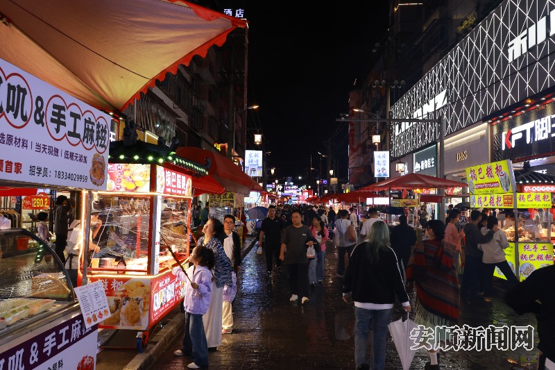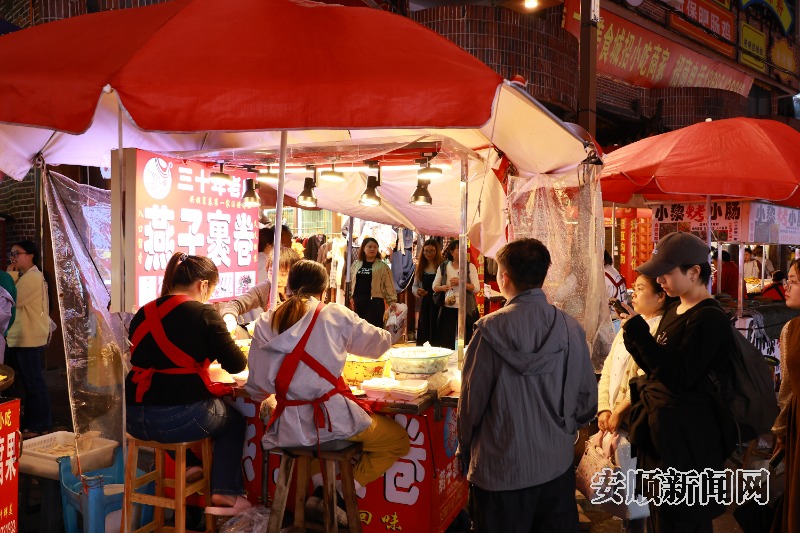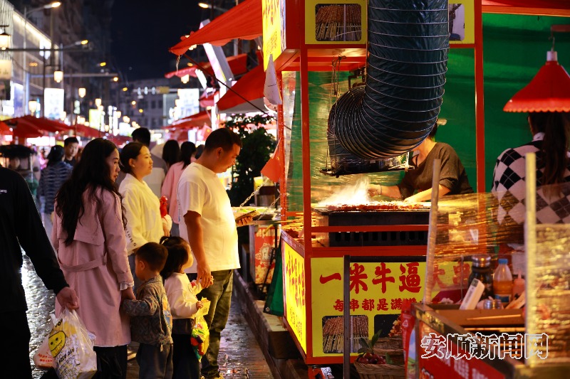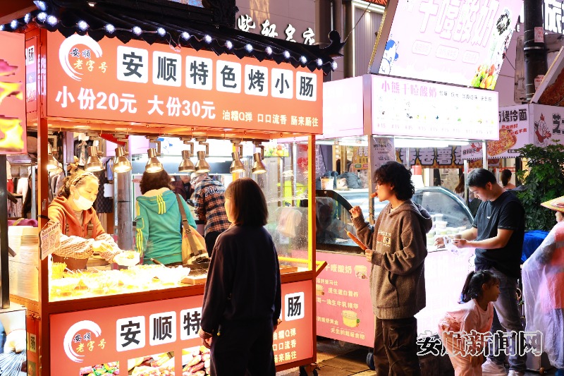 10月7日晚上8点,位于小十字的顾府街灯火通明,市民游客们穿梭于街道两旁各式各样的小吃摊,赏夜景、品美食,在欢乐祥和的氛围中共度佳节。百米长街摆满了安顺特色小吃,烤小肠在铁板上滋滋作响,刚包好的裹卷引得食客迫不及待品尝。霓虹招牌与蒸腾热气交织,扫码声与翻炒声此起彼伏。晚上十点仍摩肩接踵,这方舌尖江湖正跃动着城市最鲜活的脉搏。