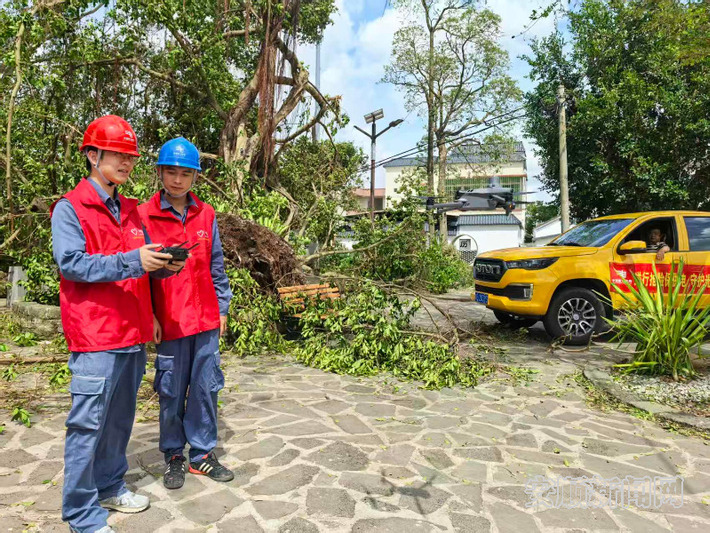 田体村的抢修现场,断落的电线缠在树枝间,多根电杆倾斜,险情肉眼可见。地面人员忙着验电、接地线、校正电杆,刘铭则操控无人机在空中巡查,精准捕捉每一处隐蔽故障,为地面作业提供指引。四人一组的抢修队员顶着烈日爬杆紧线,他便在一旁紧盯屏幕,实时反馈导线修复情况,不敢有丝毫懈怠。