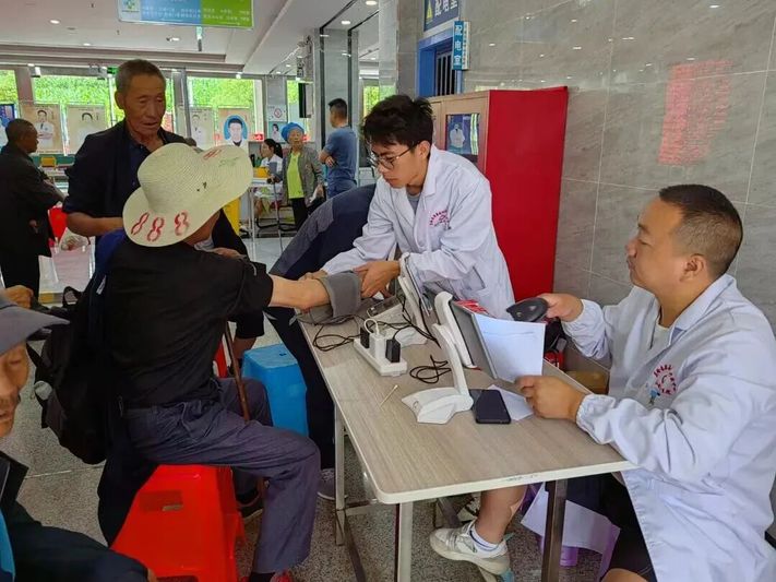 关岭自治县花江镇中心卫生院各科室医生正为患者量血压问诊