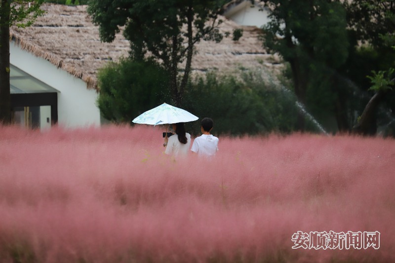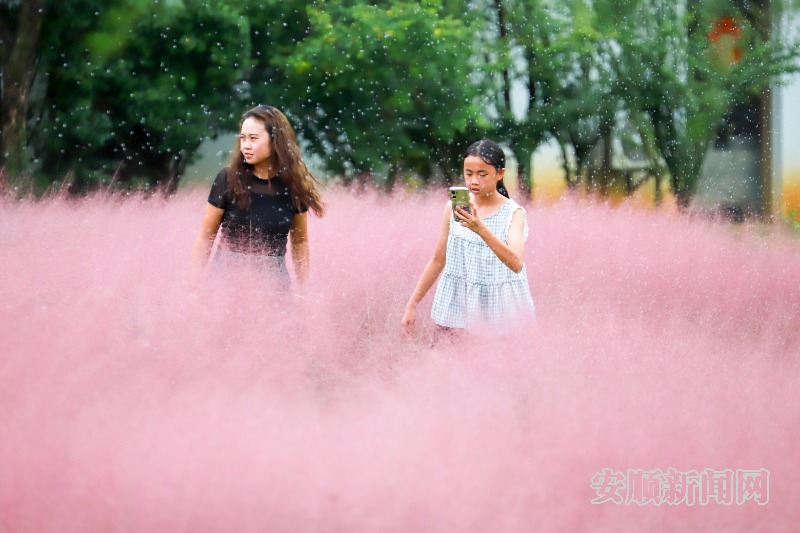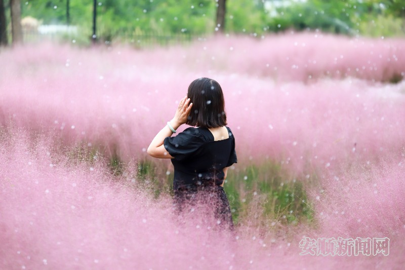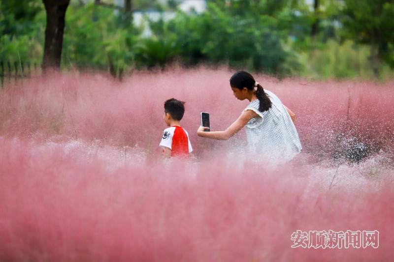 国庆期间,虹山公园内,成片的粉黛乱子草吸引众多游客前来观赏游玩打卡。图为10月5日,
