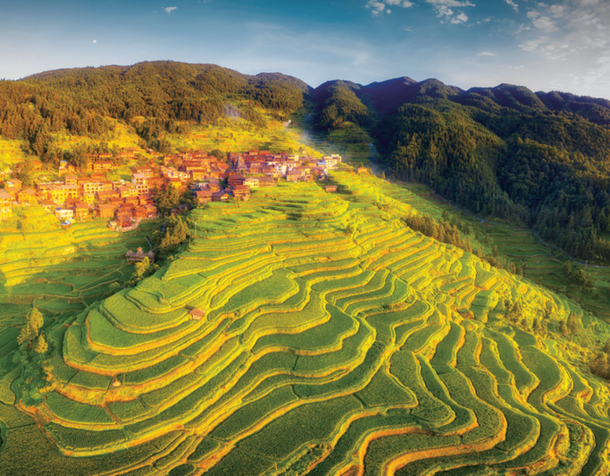 加榜梯田位于黔东南州从江县西部月亮山腹地,总面积近1万亩,从山脚盘绕到山巅,连绵25公里。金秋时节,金黄的稻穗形成饱满的金色弧线,风吹稻浪,壮美而有诗意。站在田埂上,稻香四溢,放眼望去梯田和村寨吊脚楼相辉映。在高峰观景台往下望去,近万亩的梯田遍布在山间,形成了独特壮美的景观。