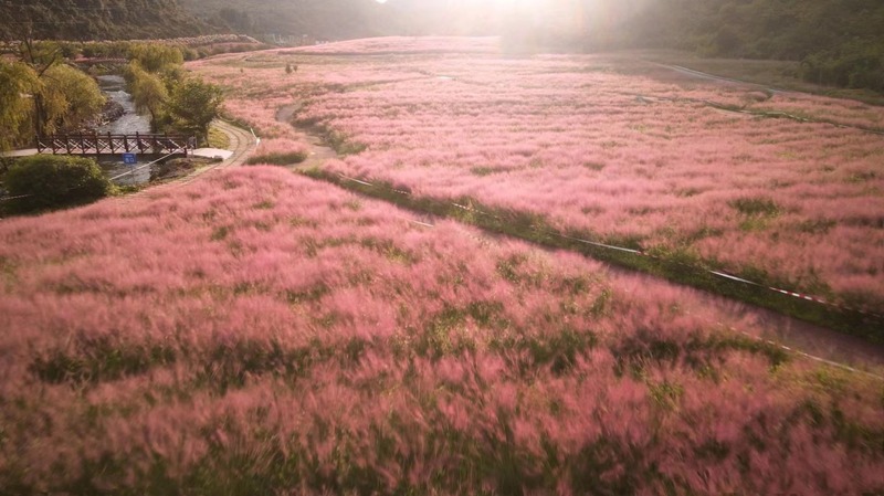 神泉谷景区位于黔南州长顺县,以喀斯特地貌与四季花海为景区特色。秋日时节,正是粉黛乱子草盛开的季节,从景区大门乘坐观光车,一路游览到神泉谷的飞花驿站,近2公里的粉黛花海映入眼帘,密密层层的粉黛草随风涌动,如同云雾一般形成“粉色花海”,犹如洒落人间的仙境!