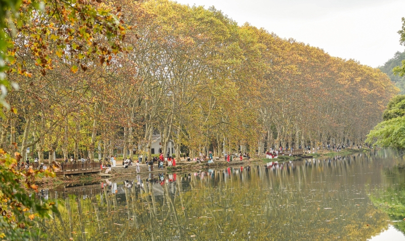 金色梧桐大道位于花溪区国家城市湿地公园上段,河段旁的一排法国梧桐,在青山秀水之中率先披上“金甲”向人们展示秋天的美景,当地人称河道边的这段景致为“黄金大道”。这里,一湾清清的溪水伴着路两旁金黄色的梧桐树。水绿得像碧玉,倒映着岸上的金黄。绿和黄交融在一起,微风乍起,细浪跳跃,满河洒满碎金。