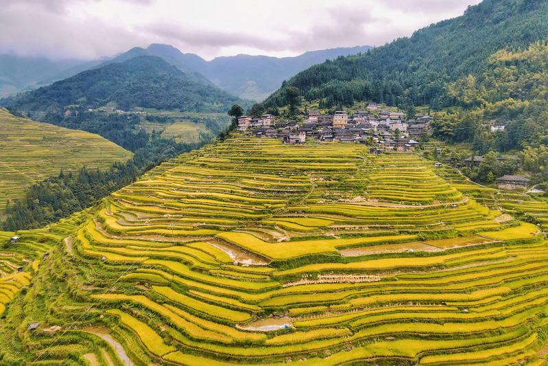 堂安梯田位于贵州省黎平县肇兴侗寨的后山坡上,别处的梯田大都是泥土做的,而这里却是用石头堆砌而成的。田埂像画框一样勾勒出梯田的轮廓,金灿灿的梯田层层叠叠,梯田内满是黄色的稻谷,随着山势的起伏,从山脚盘绕到山顶,错落有致,迎着初升的阳光煞是好看,一切都显得那么静谧。