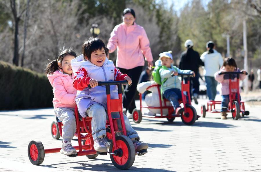 △2025年3月19日,在内蒙古鄂尔多斯康巴什区一所托育园,老师陪伴孩子做体能游戏。