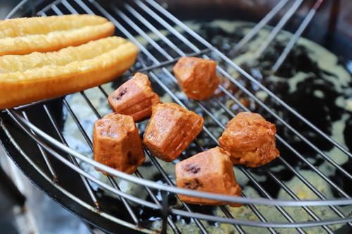店员告诉记者,制作油炸鸡蛋糕要先将优质黄豆和大米按一定比例在水里浸泡,再磨成浆,然后盛入特制容器内,加入拌好的鲜肉沫,再盛入米浆覆盖。随后,下油锅炸至定型,继续大火炸至金黄色。这样的制作过程,让鸡蛋糕外酥里嫩,鲜肉的鲜嫩保持在内部,一口咬去,鲜感十足。