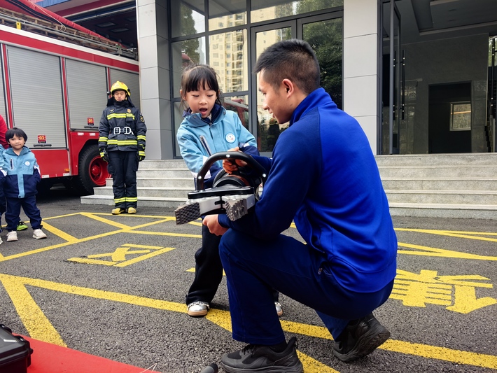 在器材展示区,消防员介绍了液压扩张器等救援装备,演示了切割器等救援装备的操作,让孩子们直观感受破拆能力。消防员还结合案例,讲解了这些工具在紧急情况下如何开辟生命通道。试穿消防服环节将活动推向高潮,孩子们穿上厚重的救援服后,亲身体验服装的重量,纷纷感叹消防员工作的不易。