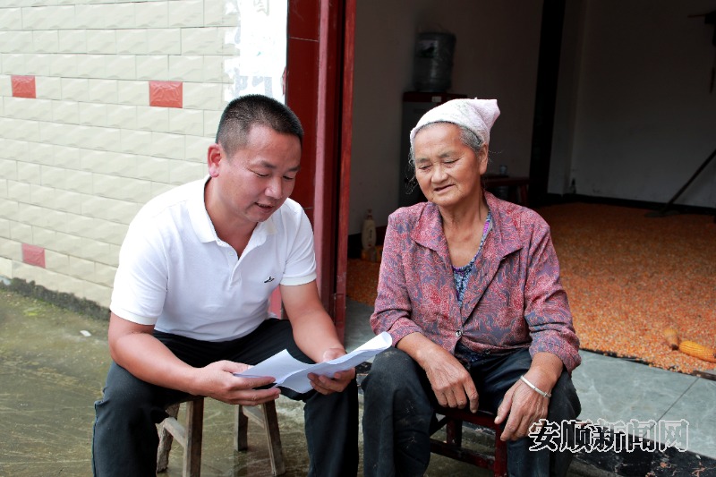 月亮湾村党支部书记潘华(左)到群众家中入户宣传村规民约