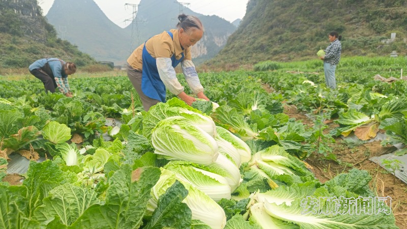 在紫云自治县猫营镇牛场坡村,秋日的田间一派忙碌景象:20余亩大白菜迎来采收,村民们在地里收割、装袋、搬运,脸上洋溢着收获的喜悦。