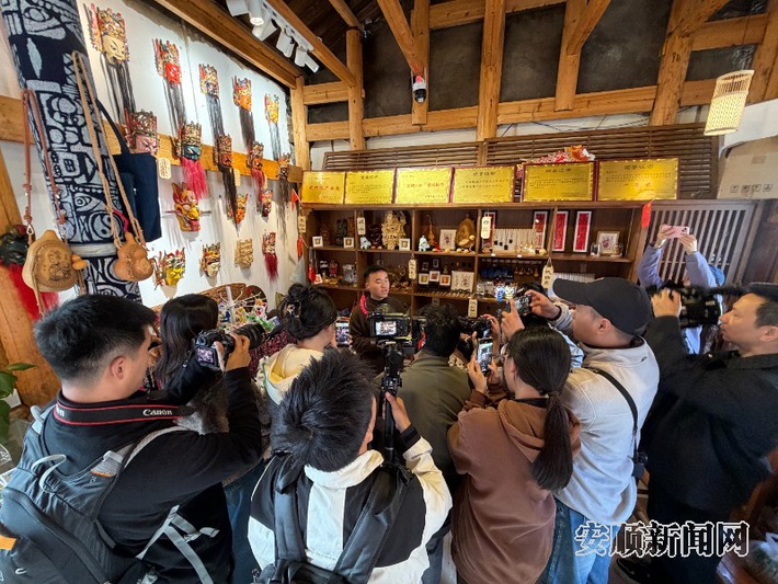 作为国家级非物质文化遗产安顺地戏的市级传承人,周顺专程为采风团带来了生动讲解。他不仅追溯了地戏源于军屯祭祀、练兵的历史渊源,详解了屯堡木雕中吉祥图案的文化寓意,还分享了新媒体时代下,通过短视频、直播等形式让屯堡文化“破圈”传播的创新实践。“让老手艺、老传统跟上新潮流,才能让更多人了解屯堡故事。”周顺的分享引发了成员们的热烈讨论。