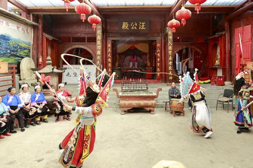 随后,嘉宾们来到吉昌村。沿途道路整洁,风景宜人,一座座石木结构的老建筑在岁月打磨下更显古朴韵味。一阵急促的鼓声将大家吸引至村内的汪公庙,一场屯堡地戏正在上演。表演者手持兵器,腾跃起舞,动作刚劲有力,引来嘉宾纷纷举起手机,记录下这精彩瞬间。