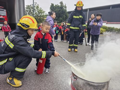 理论讲解结束后,孩子们分组进入各体验区域,在动手实践中学习消防知识。在灭火器实操区,消防员手把手教学“提、拔、握、压”操作步骤,让孩子们在模拟灭火中掌握初期火灾扑救方法,理解安全用火的重要性;云梯体验区前,孩子们依次登车体验,不仅直观感受了消防高空作业的挑战,更深刻认识到规范用火用电对生命安全的重要意义;器材参观环节,各类灭火救援装备整齐陈列,消防员逐一讲解装备功能与使用场景,尤其针对电气火灾扑救工具进行详细演示,让孩子们对“安全用电”有了更直观的认知;消防服穿戴体验则让孩子们真正“变身”小小消防员,厚重的消防防护服让他们真切体会到消防员肩负的责任与艰辛,进一步理解了“生命至上”背后的守护意义。