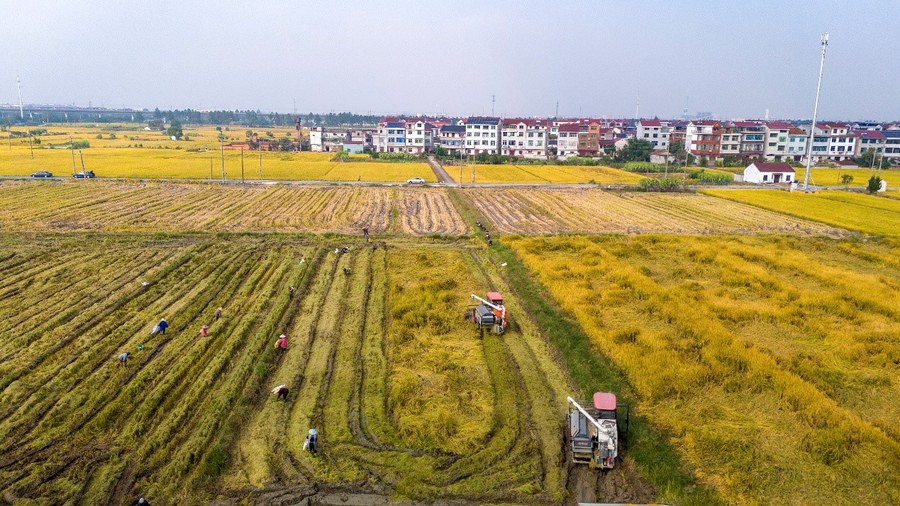 在浙江省金华市罗埠镇山下陈村,300多亩金华市农科院引进试种的“农香39”晚稻成熟,人们忙着开镰收割。新华社发