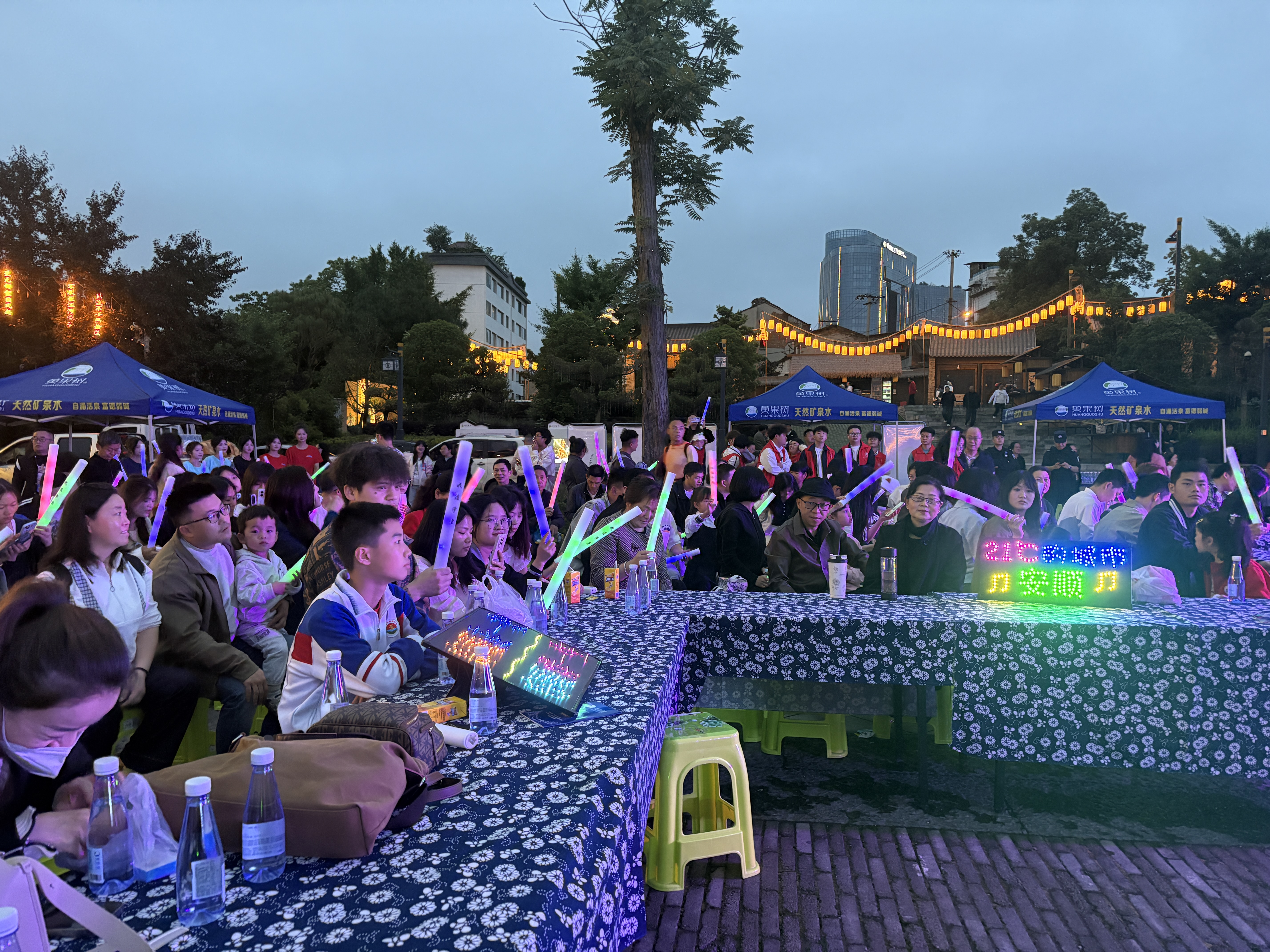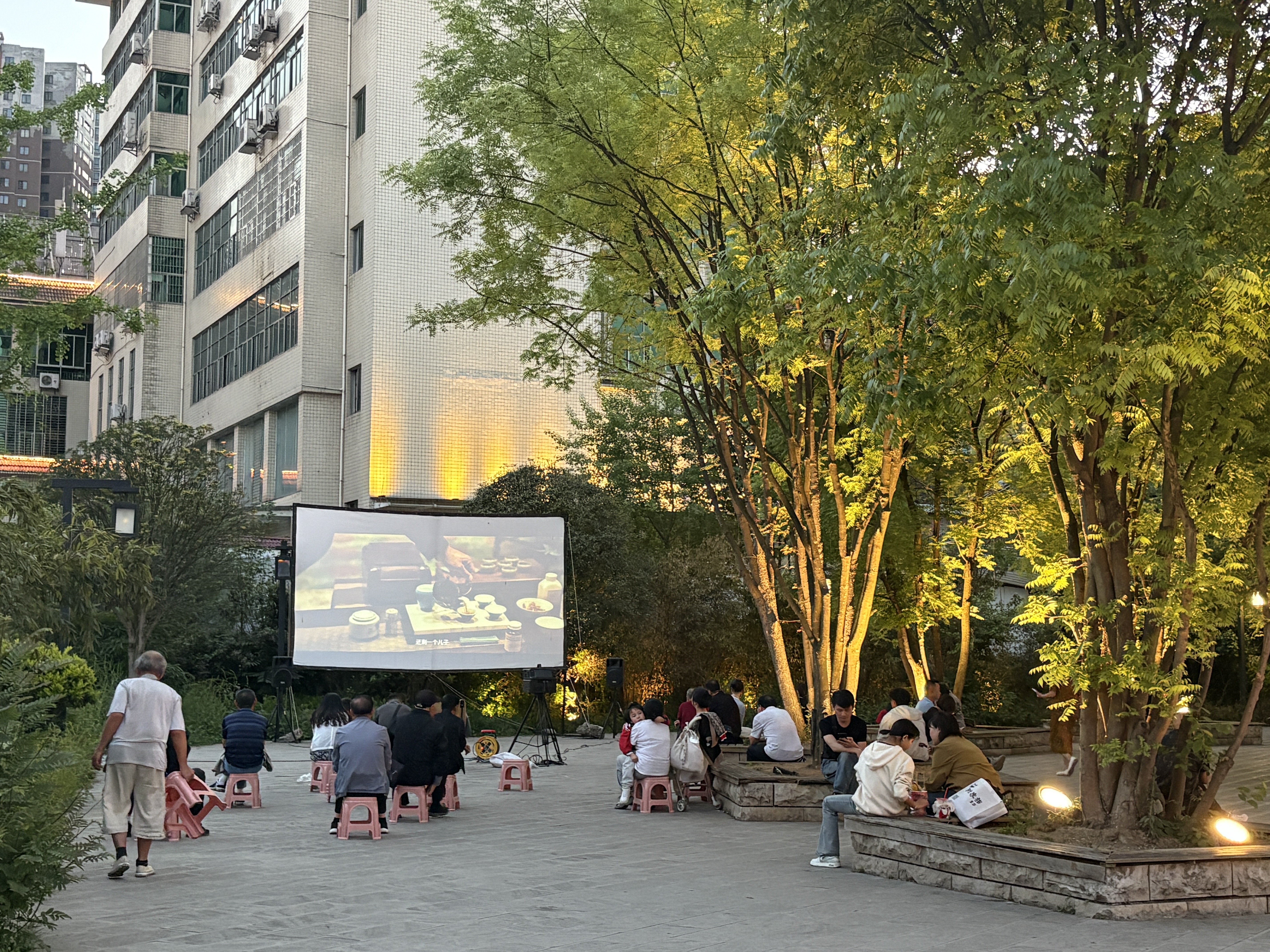 市民游客们在古城观看露天电影