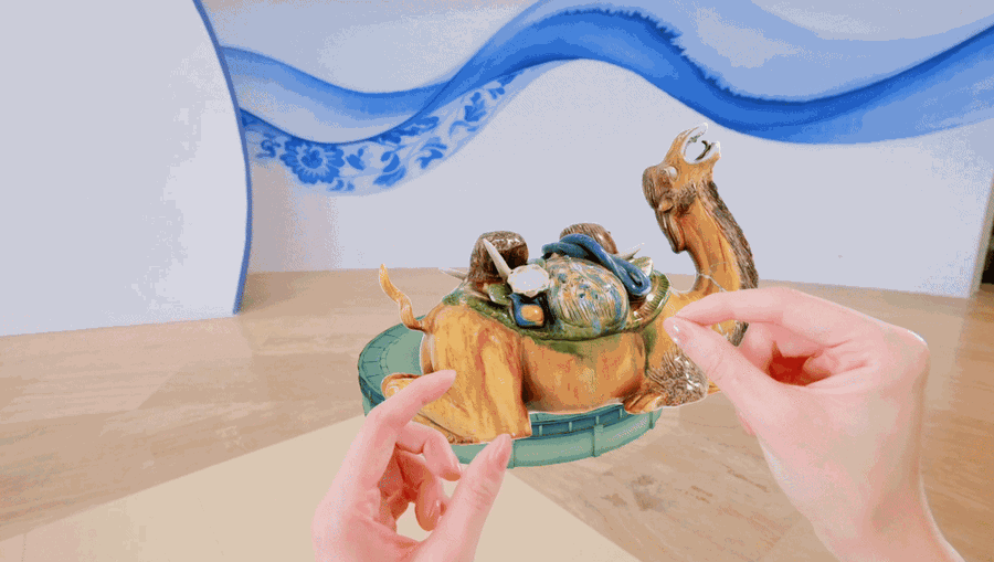“像这个唐三彩载物卧驼俑,制作惟妙惟肖,能够让观众了解古丝绸之路商贸情况。唐三彩载物卧驼俑放在展柜里,背面部分观众不易看到。现在通过MR(混合现实)眼镜,观众就可以全方位查看这件文物的各处细节。”西安博物院数字与信息部工作人员李源介绍道。