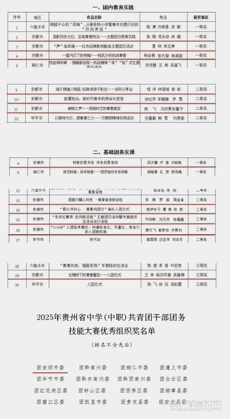 11月25日,记者从共青团安顺市委获悉,日前由共青团贵州省委、贵州省教育厅联合组织的2025年贵州省中学(中职)共青团干部团务技能大赛结果正式揭晓。安顺市代表队表现优异,在团内教育实践和基础团务实操两个组别中均取得突出成绩,共斩获4个一等奖,7个二等奖,一个三等奖等多项奖项,并荣获优秀组织奖,。