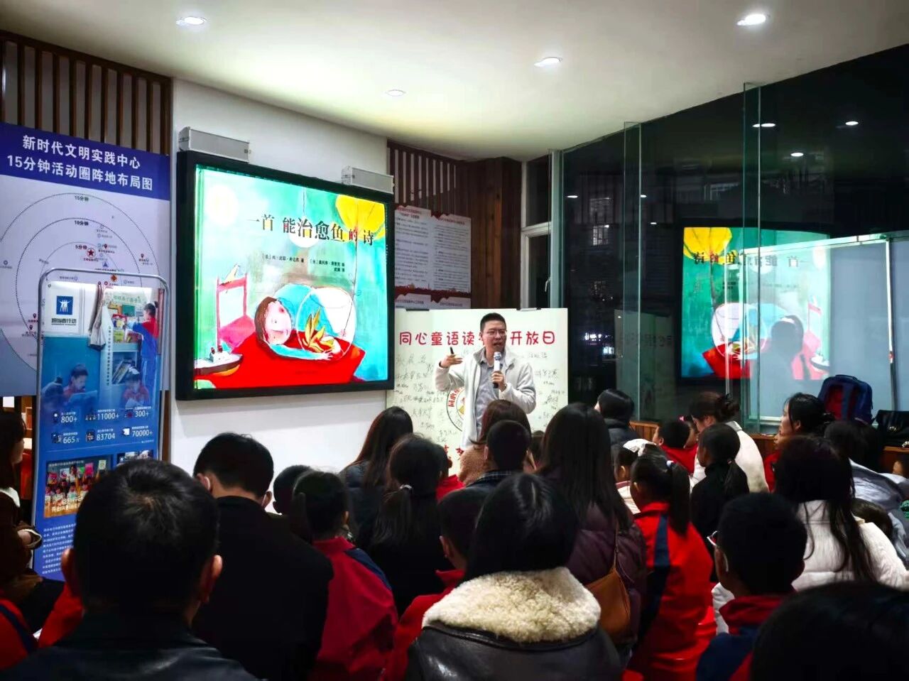 当天晚上七点半,活动现场座无虚席。活动特邀担当者儿童阅读公益推广人顾明强为主讲人。顾老师为现场家庭带来了一堂精彩的儿童绘本阅读示范课《一首能治愈鱼的诗》。通过生动形象地讲述、巧妙设计的问答环节,引导孩子们感受绘本中蕴含的生命教育意义。在顾老师的带领下,孩子们跟随着故事情节,时而凝神静思,时而踊跃发言,完全沉浸在阅读的乐趣中。