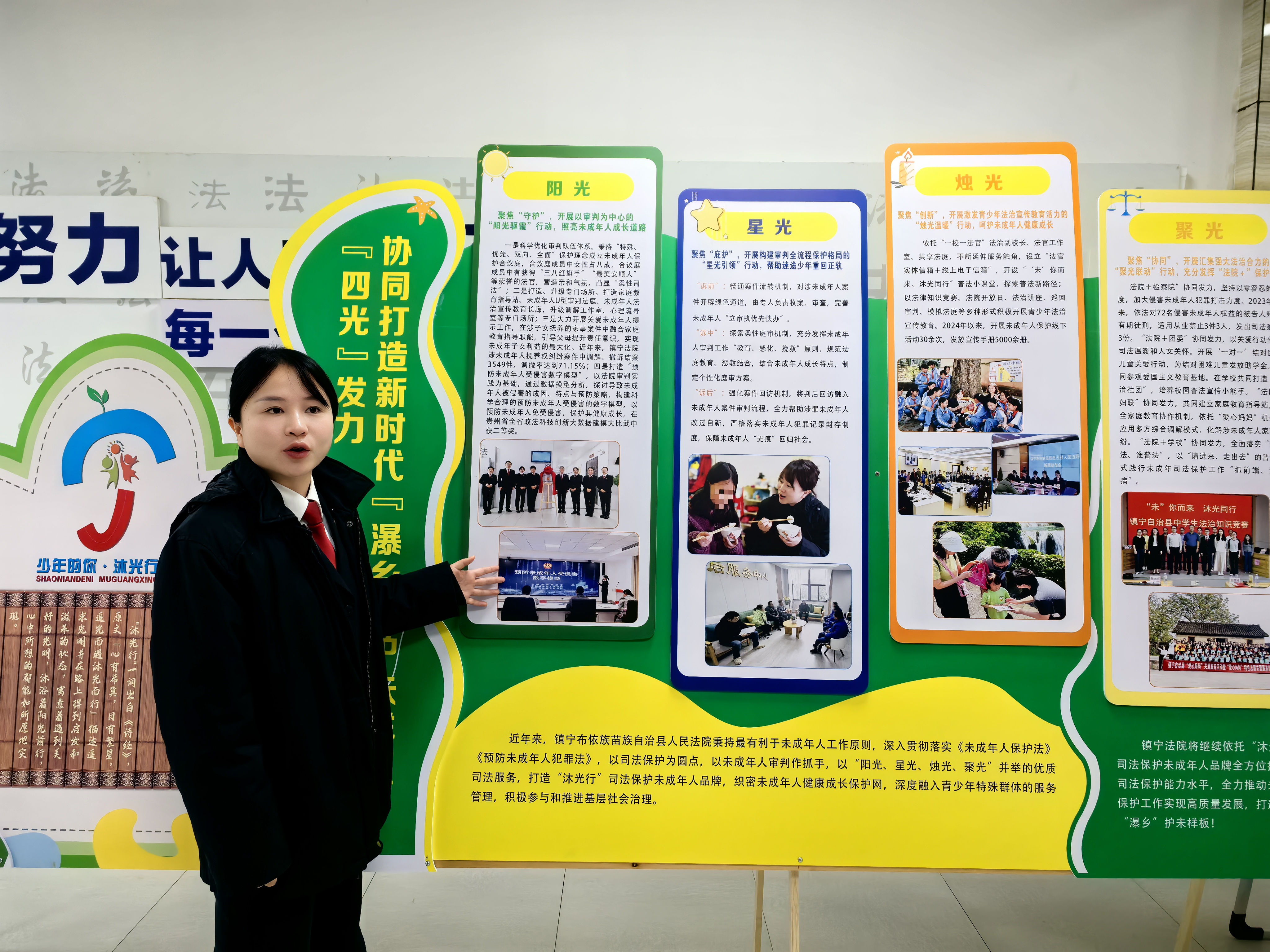 品牌塑造上,镇宁法院创新打造“少年的你·沐光行”未成年人司法保护品牌,其工作法已在央视频“今日说法”栏目播出。该品牌以“阳光、星光、烛光、聚光”四光协同体系为核心,内涵不断具象化延伸。“阳光”体系优化审判队伍,成立未成年人保护合议庭,涉未成年人抚养权纠纷案件调撤率达70.69%;“星光”体系以“沐光星憩”为载体,组建“法官妈妈”一对一帮扶团队,助力迷途未成年人回归;“烛光”体系推出定制化法治教育、“法治生日会”、法治副校长双轨信箱、在线普法视频、法律知识竞赛等多元活动,实现精准普法;“聚光”体系则以品牌为纽带凝聚社会共识,推动保护工作从“单打独斗”变为“众人拾柴”。
