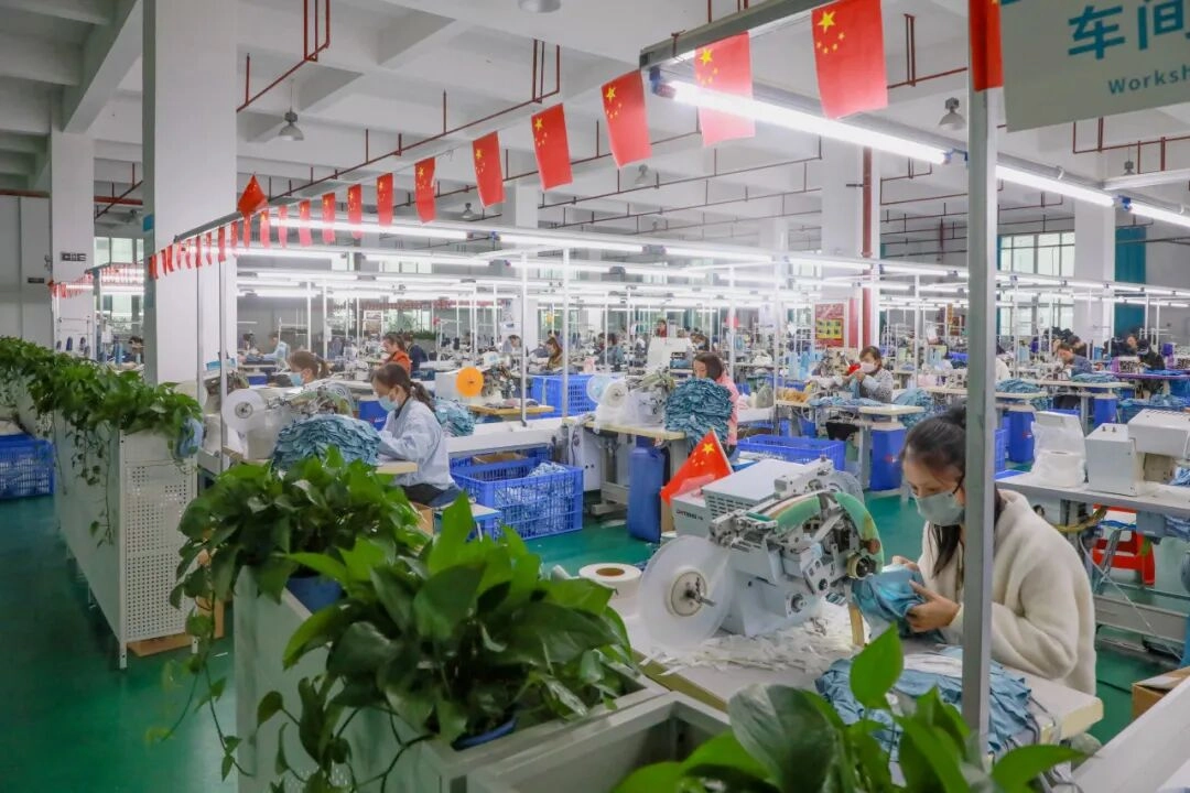 顺博(贵州)科技服饰有限公司生产车间内,工人正在忙碌